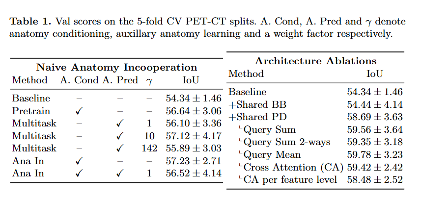 为研究如何将解剖知识融入模型训练,我们在 PET-CT 领域进行了五折交叉验证下的多项消融实验。基线对比模型是一个仅使用病理标签训练的 Mask2Former [5] 模型。表 1(左)报告了多种朴素解剖融合方法的 5 折验证 IoU 分数。