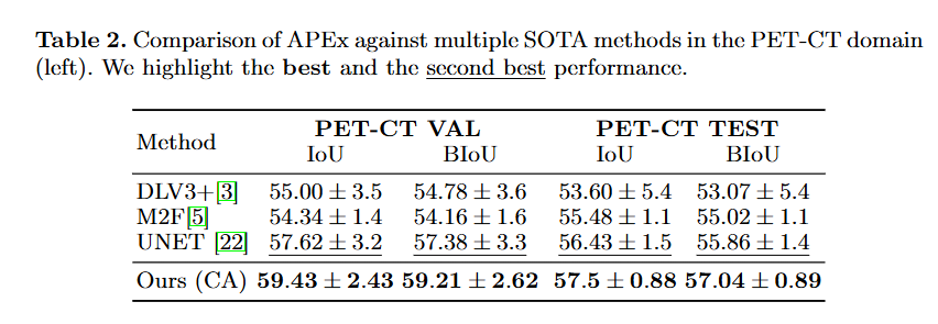 表 2. PET-CT 领域 APEx 与多种 SOTA 方法的对比(左)。最佳与次佳结果已标出。