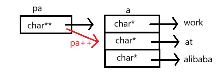 {char* a[] = { "work","at","alibaba" };char** pa = a;pa++;printf("%s\n", *pa);return 0;