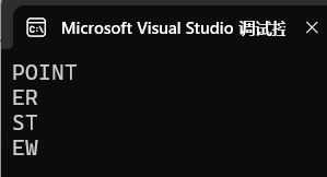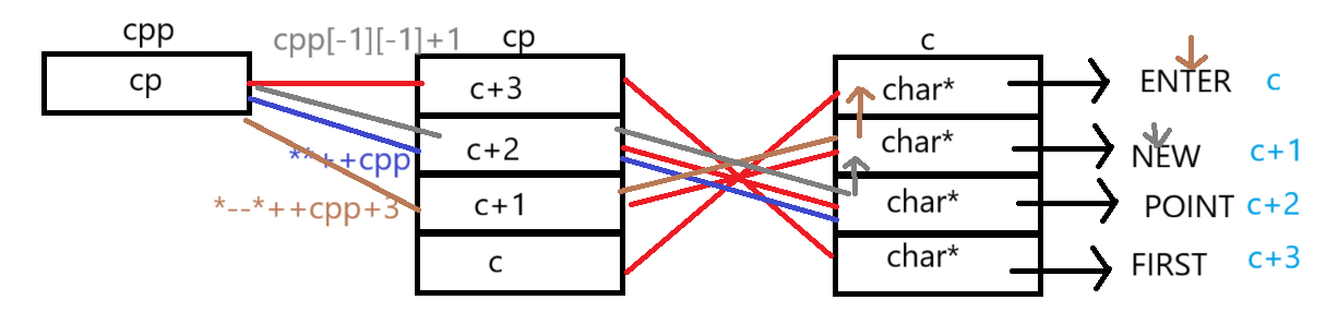 {char *c[] = {"ENTER","NEW","POINT","FIRST"};char**cp[] = {c+3,c+2,c+1,c};char***cpp = cp;printf("%s\n", **++cpp);printf("%s\n", *--*++cpp+3);printf("%s\n", *cpp[-2]+3);printf("%s\n", cpp[-1][-1]+1);return 0;