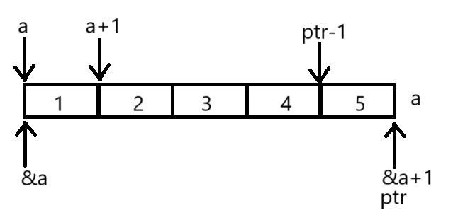 {int a[5] = { 1, 2, 3, 4, 5 };int* ptr = (int*)(&a + 1);printf("%d,%d", *(a + 1), *(ptr - 1));return 0;