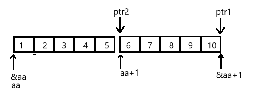 {int aa[2][5] = { 1, 2, 3, 4, 5, 6, 7, 8, 9, 10 };int* ptr1 = (int*)(&aa + 1);int* ptr2 = (int*)(*(aa + 1));printf("%d,%d", *(ptr1 - 1), *(ptr2 - 1));return 0;