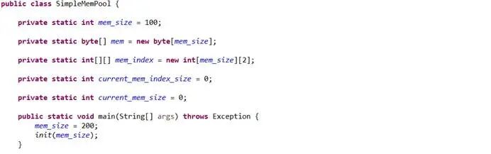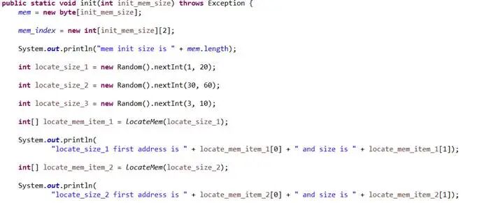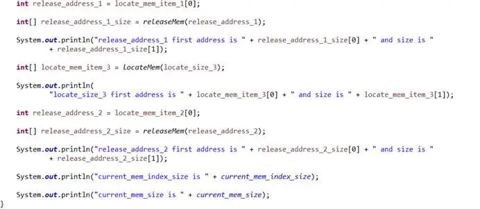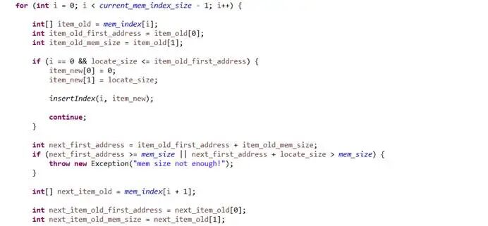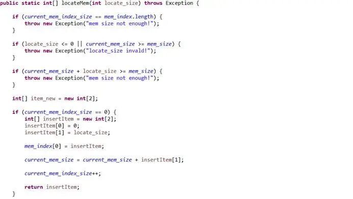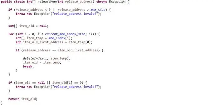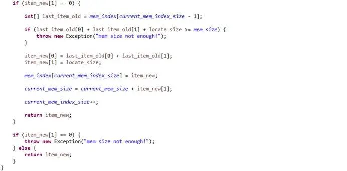使用内存索引记录内存的分配,其数据结构是二维数组,二维数组的每个元素表示已申请的内存块,例如,内存索引的二维数组[[0,20],[30,10]],其中,[0,20],0表示内存块的起始地址,20表示已分配的内存块的大小,以此类推。 请求分配内存块的业务逻辑,遍历内存索引的二维数组,判断是否有剩余的内存空间分配,有则分配内存块,在内存索引的二维数组中,插入新分配的索引,更新内存索引的二维数组,返回已分配的内存块的起始地址,没有内存块分配,则返回error。 请求释放内存块的业务逻辑,遍历内存索引的二维数组,判断是否存在对应起始地址的内存块,有则释放对应的内存块,在内存索引的二维数组中,删除对应的内存块,更新内存索引的二维数组,返回已释放的内存块的起始地址,没有对应的内存块,则返回error。 |