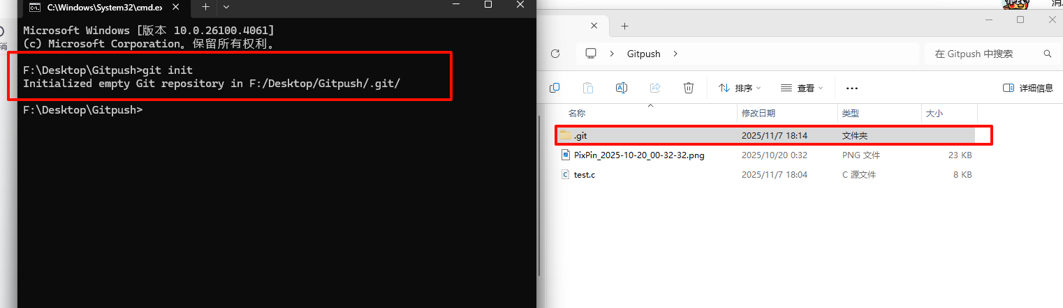 3.Git初始化,在命令提示符中输入 git init 输入之后会创建一个.git文件夹里面存放着git的操作数据