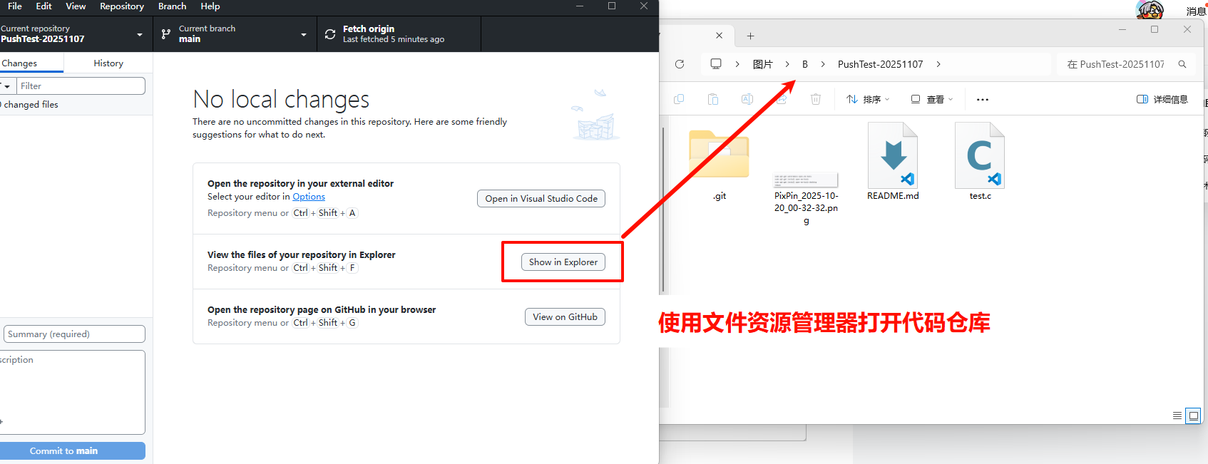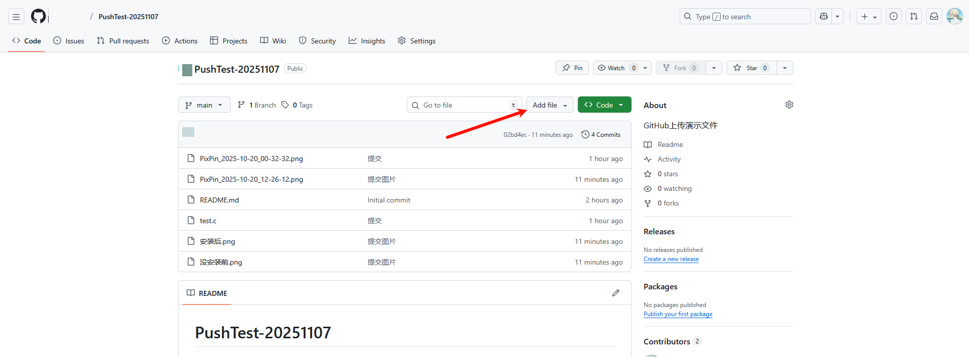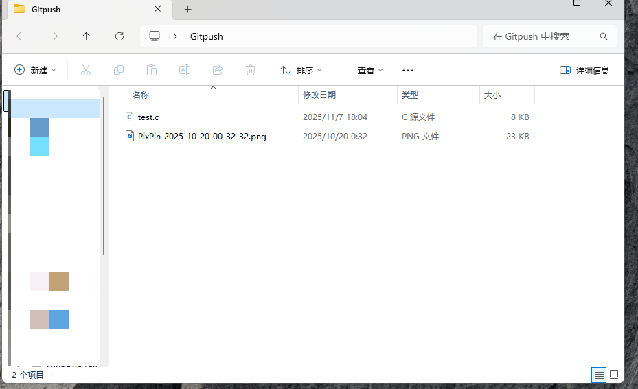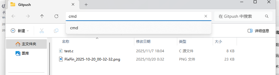 1.打开本地项目的文件夹,这里我新建了一个“Gitpush”里面放了一个c文件和一个截图演示需要上传的文件。