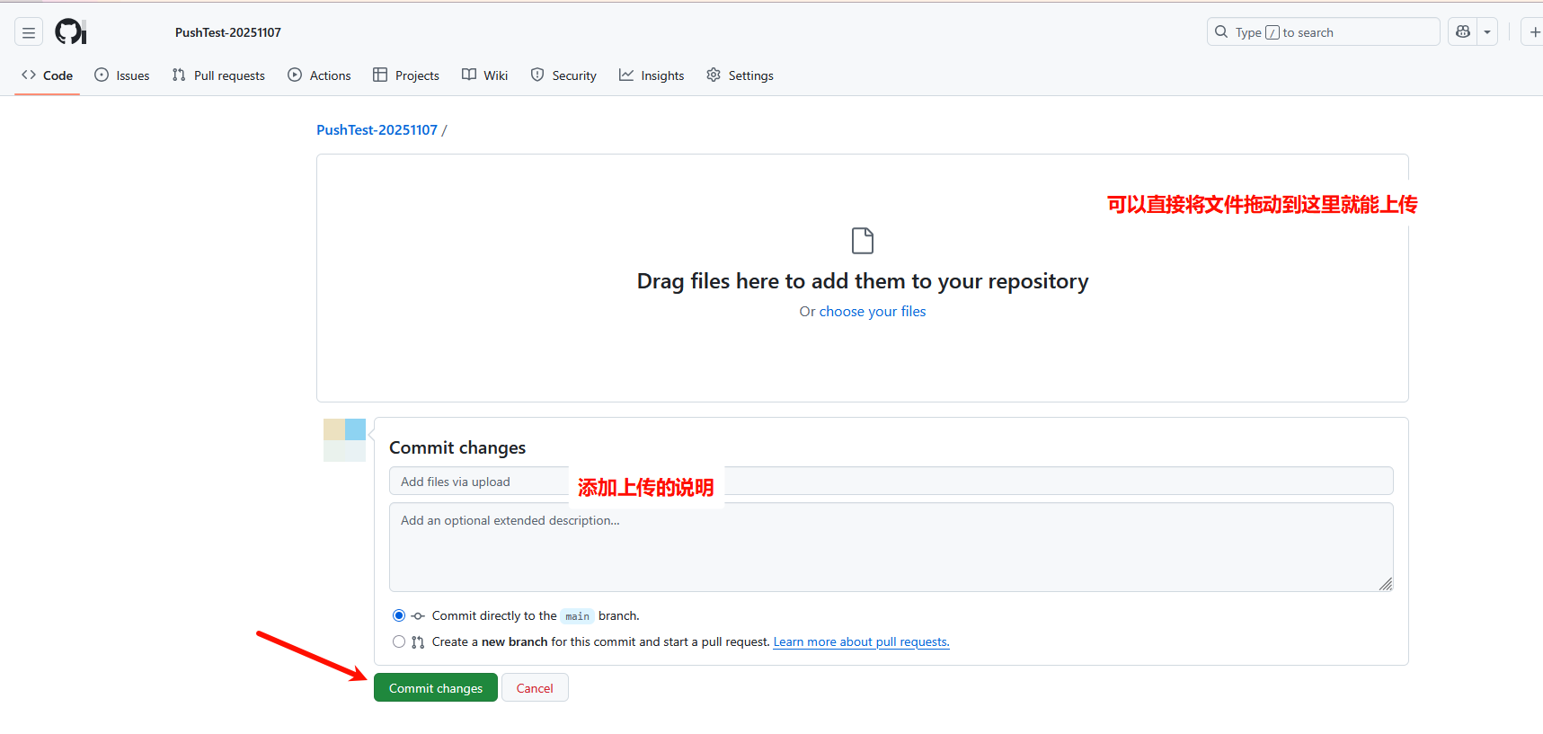 git commit -m "提交说明:如「上传项目源码、配置文件」"