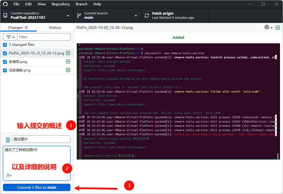 然后可以将你需要上传的文件,直接复制过去。我这里复制了三个图片上来,马上就在软件上看到提示有三个文件更改了。