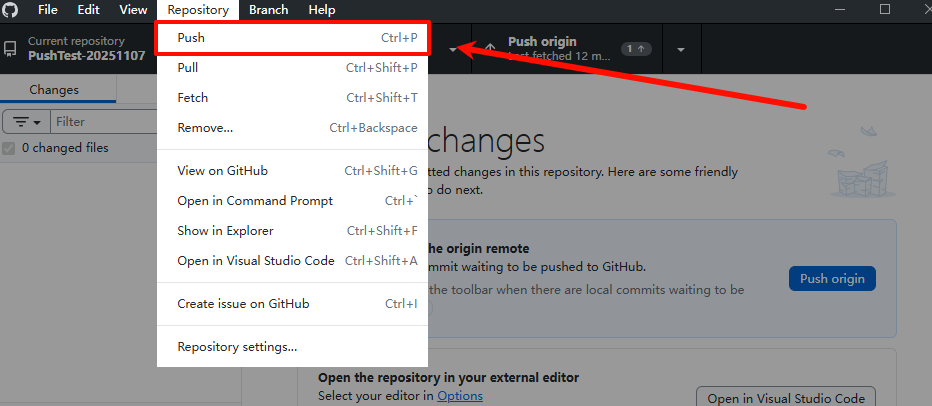 5.推送到远程仓库,提交之后点击导航栏上的Repository-push,或者你按下快捷键CTRL+P