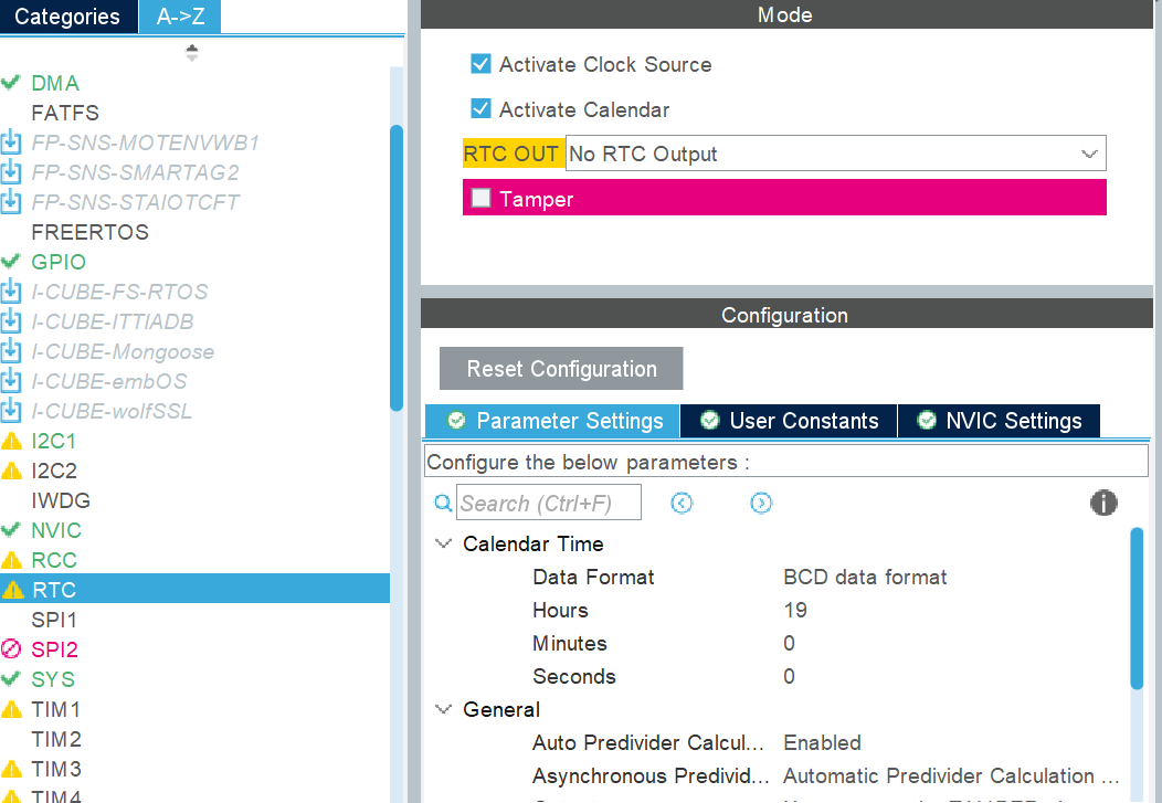 芯片内置了RTC模块可以用来进行实时时钟的实现,下面看配置和程序来实现实时时钟:
