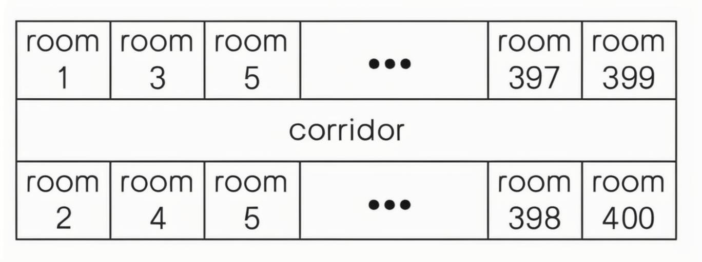 楼层中间是走廊,两侧各有 200 个房间,编号如图。