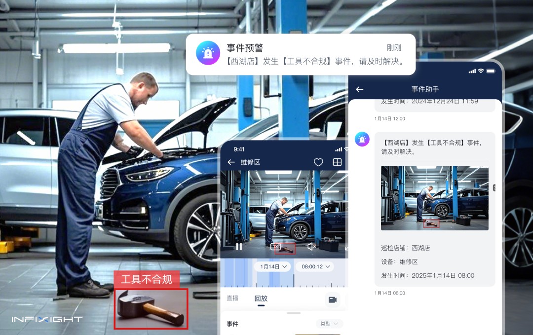 通过计算机视觉技术,系统能够实时识别改装区域使用的工具类型。当检测到榔头等高暴力值不合规工具时,系统会自动发出提醒,帮助管理者及时干预,避免因工具使用不当造成的车辆损伤和客诉问题。