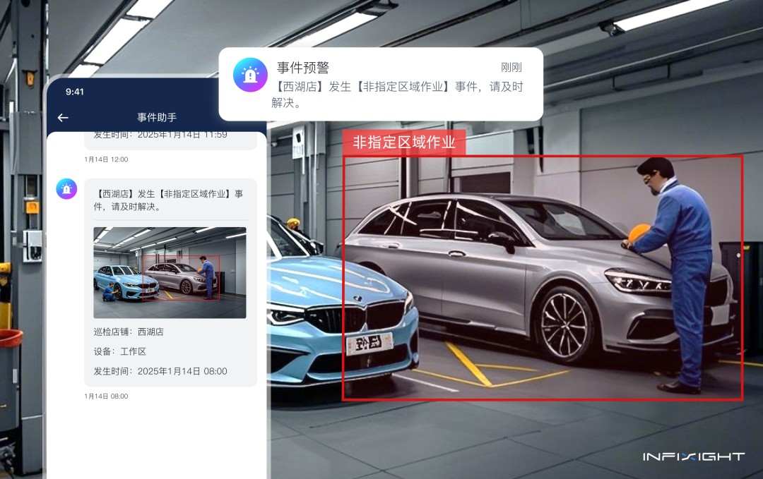 贴膜作业需要在专用区域进行,系统通过视频分析技术,能够识别车辆是否停放在指定区域。当检测到在非指定区域进行贴膜操作时,会自动触发预警机制。