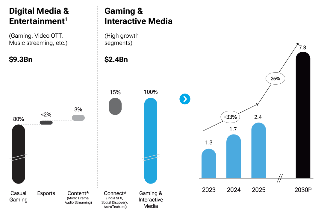 根据Bitkraft Ventures和Redseer Strategy Consultants的最新报告,印度的数字媒体与娱乐市场在2025财年达到93亿美元,其中,游戏和互动媒体是主要的增长引擎,2025财年其市场规模为24亿美元,预计到2030财年将增长至78亿美元。数字游戏市场预计将翻倍,在2030年达到43亿美元,电子竞技将增长三倍,达到1.2亿美元。内购收入预计将增长六倍,混合休闲游戏成为关键增长领域,而战术竞技类游戏继续引领收入。