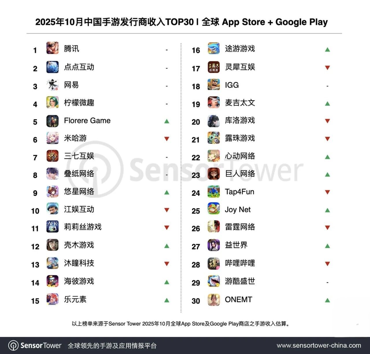 近日,Sensor Tower公布了10月份的中国手游发行商全球收入排行榜。