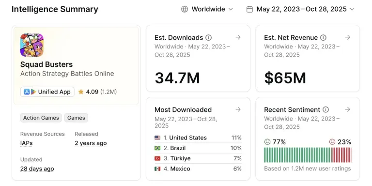 根据估算,Supercell即将关闭的《Squad Busters》已实现6500万美元的IAP收入。这款游戏于2024年5月全球上线,经过短暂的软启动后,累计下载量达3470万次。