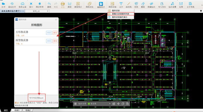所有散流器识别完成后,【查看已识别图形列表】功能可快速查看俩种散流器的工程量;该界面中的【导出列表到Excel】功能可将工程量保存到工程量清单中。