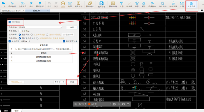 【文字查找】功能可快速定位图纸信息;通风管道部件工程量计算通过【图形识别】能高效识别附件数量,点击识别列表也可复核识别图形,十分便捷。