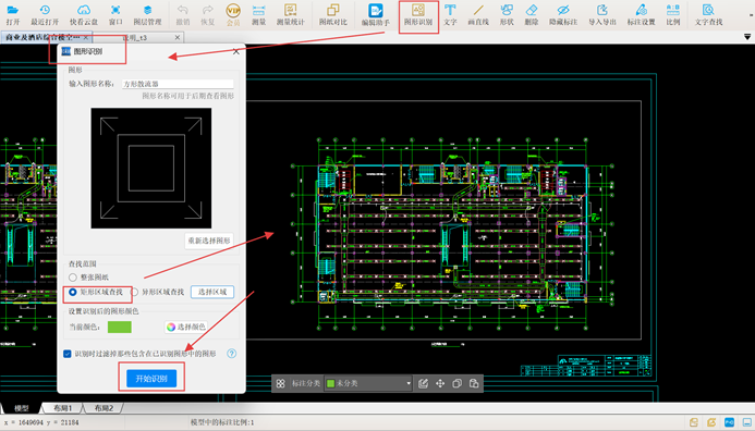 3. 在CAD快速看图中使用【图形识别】功能,精确框选图例后,在绘图区空白处右键确认;无误后,在对话框中输入图形名称“方形散流器”,便于后续复核。设置识别范围为五层空调通风平面图,启动自动识别统计;其他散流器识别方法与之相同,不再赘述。