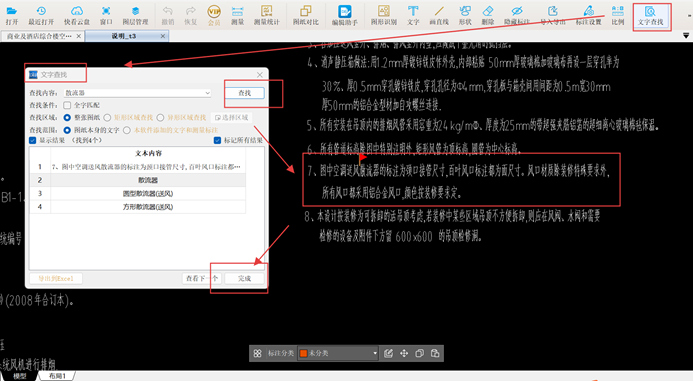 2. 在计算前,为明确散流器的材质及规格等细节,需查阅设计说明。首先,借助CAD快速看图软件的【文字查找】功能,输入关键词“散流器”并设定搜索范围,精准定位相关说明内容。随后,使用【提取文字】工具,将关键信息直接复制到计算表格中。