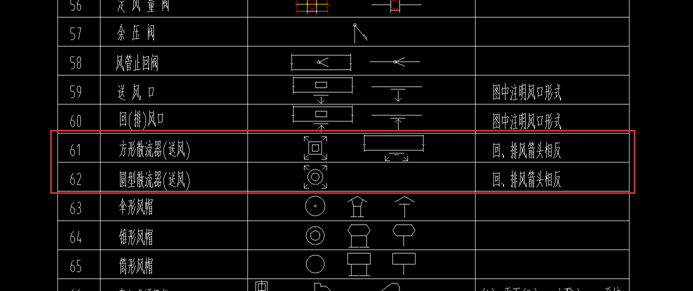 图中空调送风散流器的标注为颈口接管尺寸,百叶风口标注都为面尺寸。风口材质除装修特殊要求外,所有风口都采用铝合金风口,颜色按装修要求定。