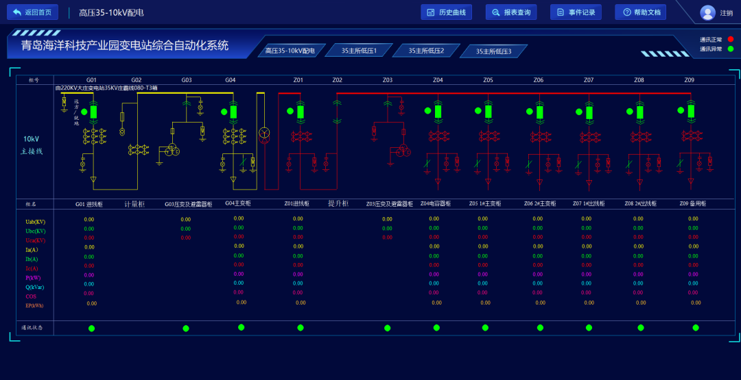 该园区变电站采用 35kV 单电源进线设计,主站作为电力调度核心,为两座 10kV 分所提供稳定电源。系统在硬件配置上实现科学分区:35kV/10kV 降压变压器回路采用主变保护屏集中组屏模式,集成差动保护、高低后备保护、测控装置等核心设备,集中部署于电气监控室;其余回路则在就地开关柜配置独立保护装置,形成 “集中监控 + 就地防护” 的双重保障。
