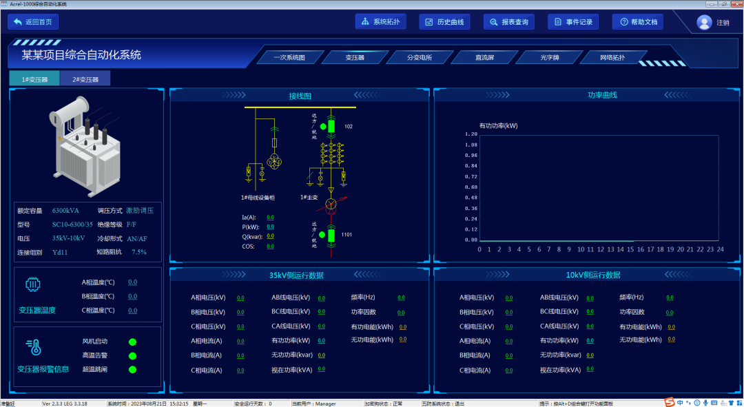 针对核心设备主变压器,系统设置独立监测界面,详细展示变压器型号、容量、绝缘等级等基础信息,同步监测高低压两侧电参量、三相温度及冷却系统状态,通过功率曲线直观呈现运行趋势,具备高温告警、超温跳闸等多重保护功能。两座 10kV 分所均配备独立监测模块,可捕捉断路器状态、手车位置、保护跳闸等开关量信号,实现分区域电力运行的精细化管控。