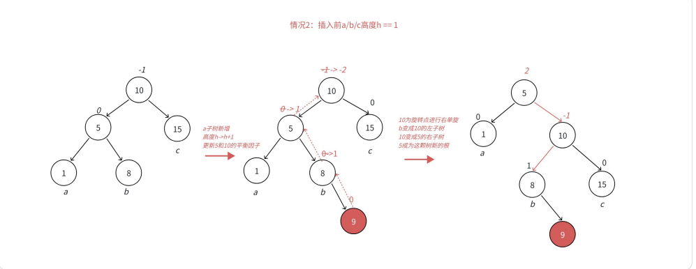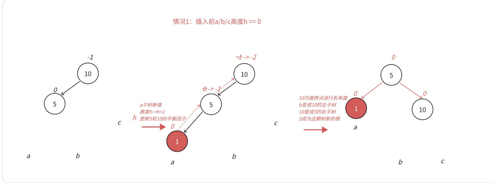 场景3:h==0时,a/b/c都是空树,b自己是一个新增结点,不断更新5->10平衡因子,引发旋转,其中8的平衡因子为0,旋转后8和10和5的平衡因子均为0.