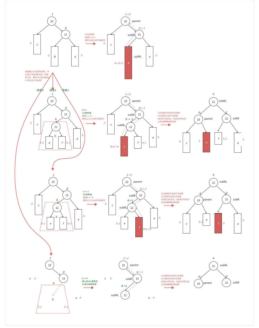 void RotateRL(AVLNode* pParent) {//右边高的左边高AVLNode* parent = pParent->_right;AVLNode* SubL = parent->_left;int bf = SubL->_bf;RotateR(parent);RotateL(pParent);if (bf == 0) {SubL->_bf = 0;parent->_bf = 0;pParent->_bf = 0;}else if (bf == 1) {parent->_bf = 0;SubL->_bf = 0;pParent->_bf = -1;}else if (bf == -1) {parent->_bf = 1;SubL->_bf = 0;pParent->_bf = 0;}
