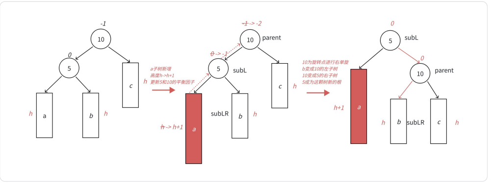 在a子树插入一个新结点,导致a子树的高度从h变为h+1,不断向上更新平衡因子,导致10的平衡因子从1变为2,10为根的树左右高度差超过1,违反平衡规则,10为根的树右边太高了,需要往左边旋转,控制两棵树的平衡