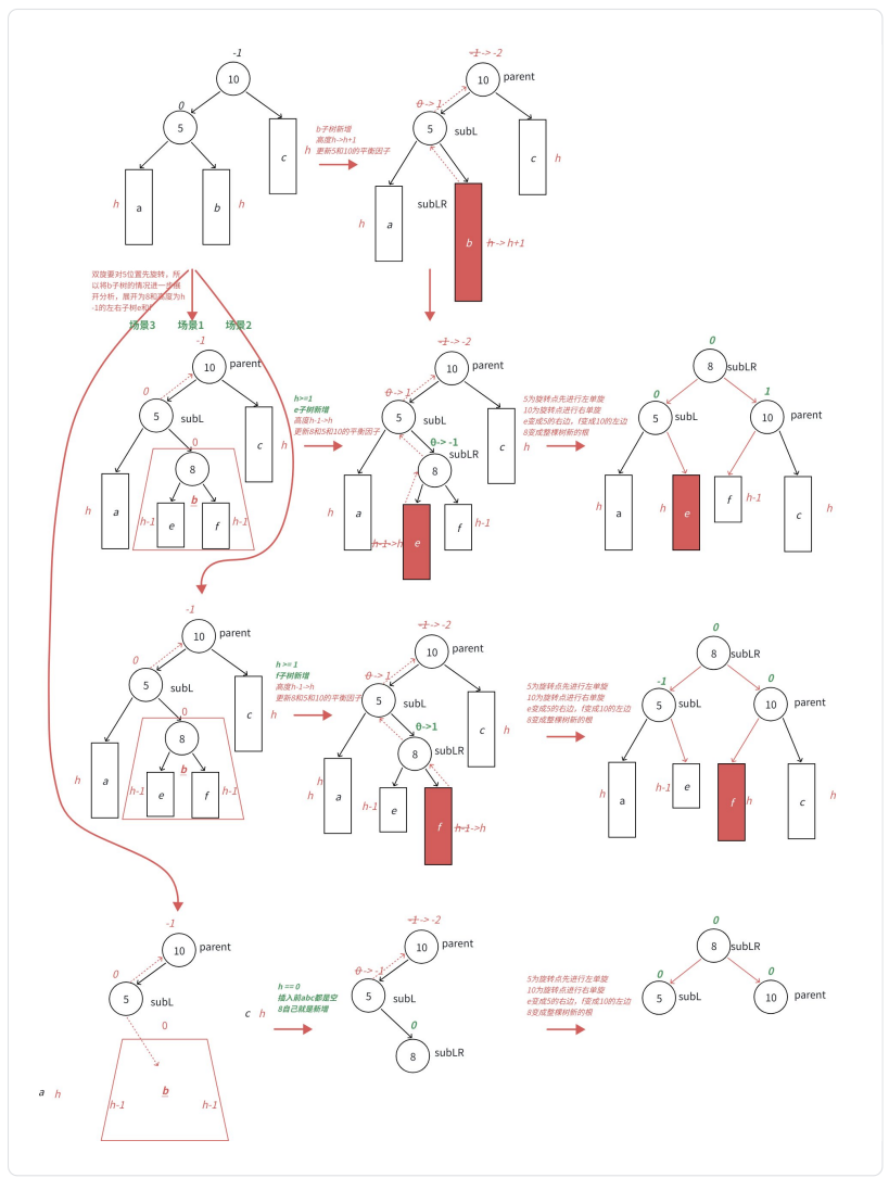 场景1:h>=1时,新增结点插入在e子树,e子树高度变为h并不断更新8 5 10平衡因子,导致旋转,其中10的平衡因子为-2,5的平衡因子为1,符合(左边高的右边高)进行左右双旋,旋转后的5平衡因子为0,8的平衡因子也为0,10的平衡因子为1.