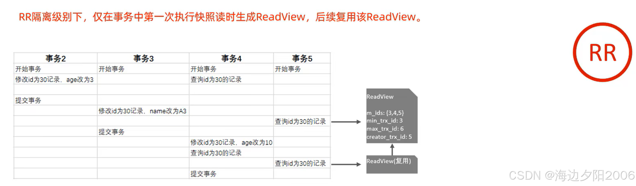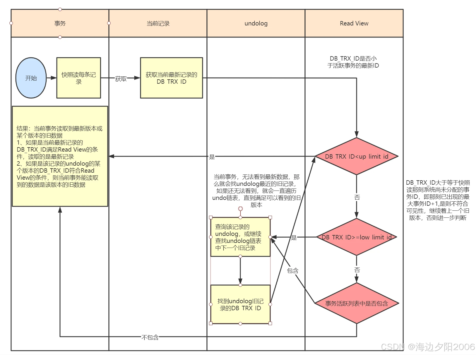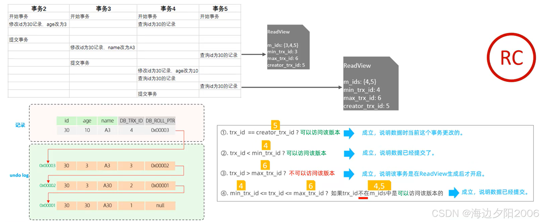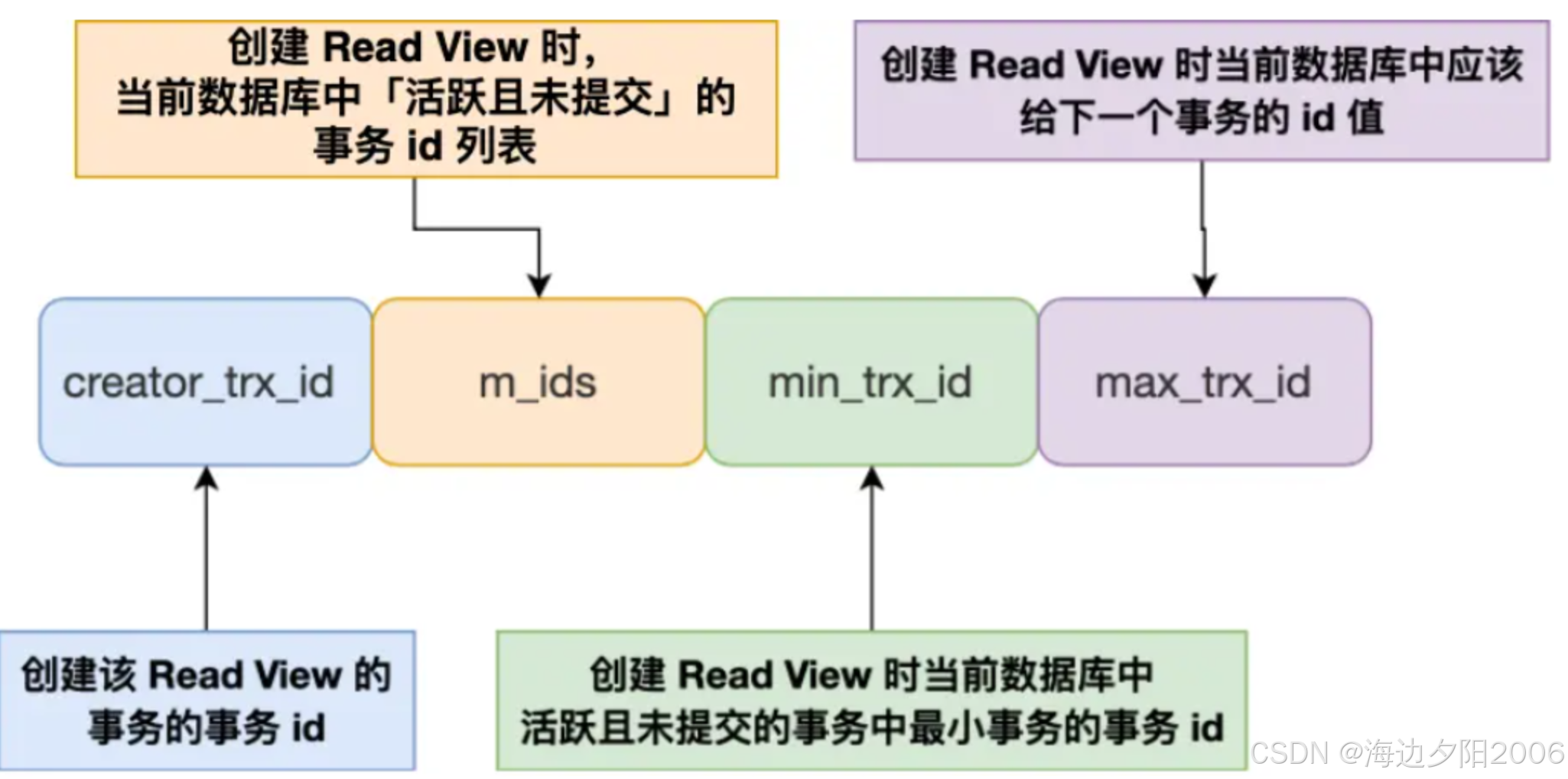 - 如果数据版本的事务ID小于Read View中的min_trx_id,则表示该版本是由已提交的事务生成的,对当前事务可见
