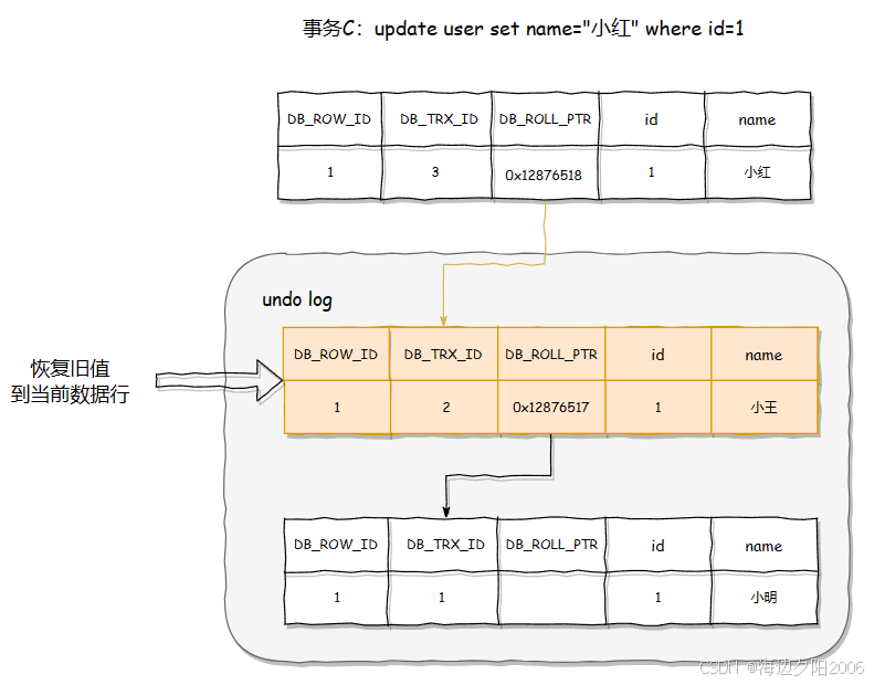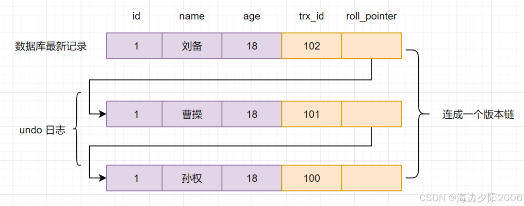 当事务修改数据时,数据库会先将修改前的数据保存到Undo Log中,然后再执行实际的数据修改。这样,当需要查看历史版本时,可以通过回滚指针链找到相应的Undo Log记录。如下图所示: