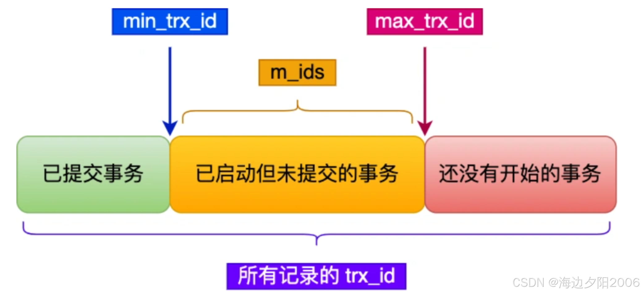 - 如果数据版本的事务ID在min_trx_id和max_trx_id之间,则需要检查该事务ID是否在m_ids列表中: