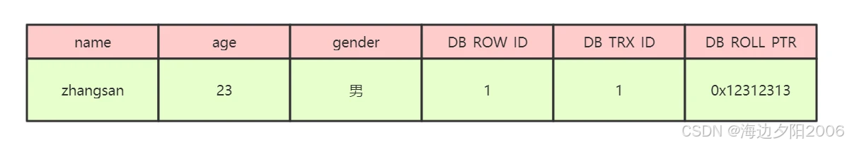 - 行标识(DB_ROW_ID):隐含的自增ID(隐藏主键),用于唯一标识表中的每一行数据,如果数据表没有主键,数据库会自动以DB_ROW_ID产生一个聚簇索引