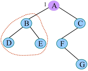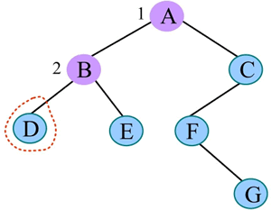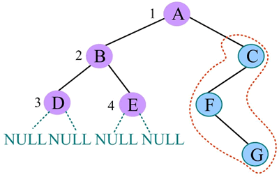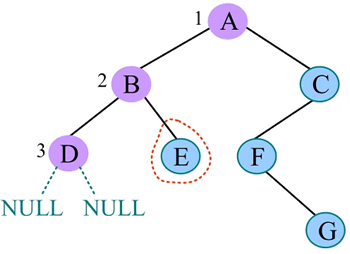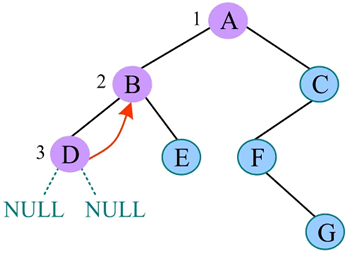 4) 先序遍历 D 的右子树,D 的右子树为空,返回 B: