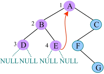6) 访问根 E,先序遍历 E 的左子树,E 的左子树为空,返回 E。先序遍历 E 的右子树,E 的右子树为空,返回 A: