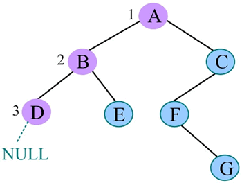 3) 访问根 D,先序遍历 D 的左子树,D 的左子树为空,什么也不做,返回 D: