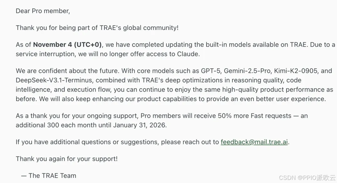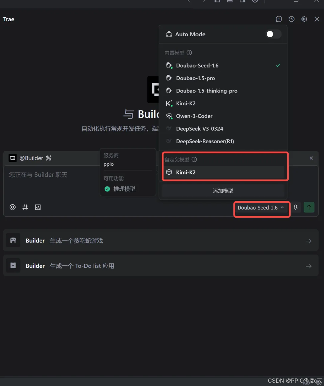 尽管 Claude 模型被禁,但 Trae 依然可提供 GPT-5、Gemini-2.5-Pro、Kimi-K2-0905 和 DeepSeek-V3.1-Terminus 等核心模型。同时,作为 Trae 的模型服务商,PPIO 提供的高性能模型 API 服务已官方接入 Trae,用户可自定义添加 PPIO 的代码模型,包括: