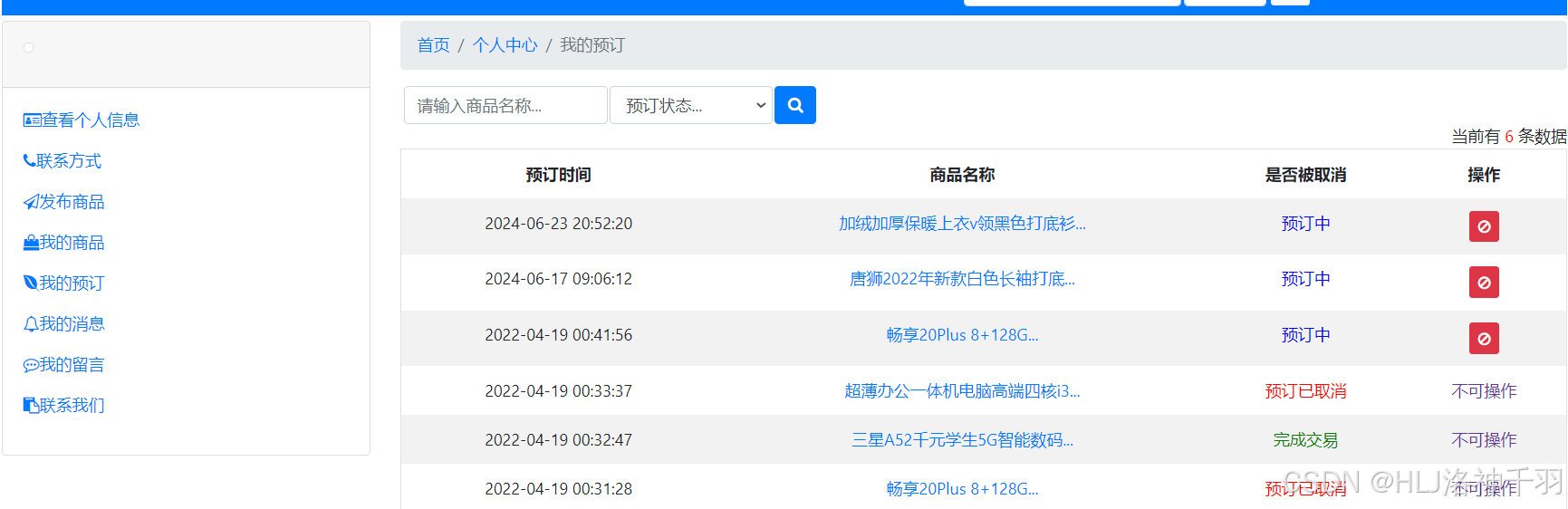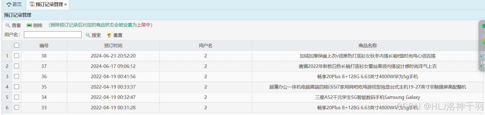 | 预期结果 | 10.1 用户点击查看按钮后,系统应正确展示目标商品的预定信息,包括预定详情。 11.1 系统应能显示选中商品的预定信息详情,包含预定时间、用户名称及商品名称等数据。 12.1 执行删除操作后,系统应从数据库中移除相关商品的预定记录,并在用户界面上同步更新,不再显示已删除的预定信息。 |