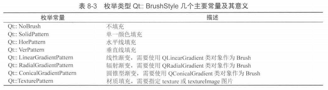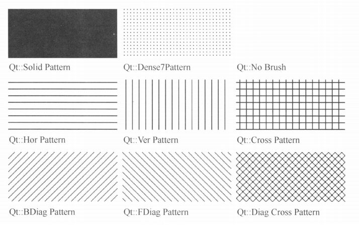 渐变填充需要使用专门的类作为Brush赋值给QPainter。其他各种线型填充只需设置类型参数即可,使用材质需要设置材质图片。