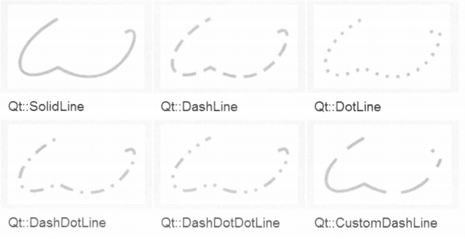 Qt::SolidLine:实线(默认);Qt::DashLine:虚线(短横线间隔);Qt::DotLine:点线(圆点间隔);Qt::DashDotLine: dash+dot 交替;Qt::DashDotDotLine: dash+dot+dot 交替;Qt::NoPen:无线条(不绘制)