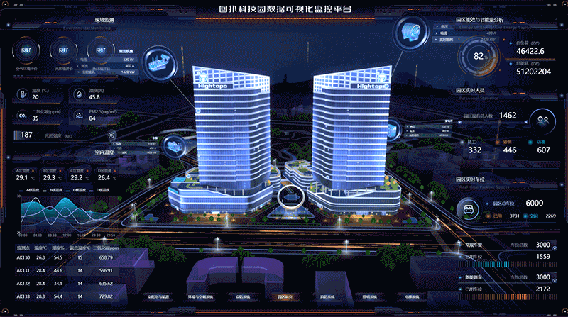 基于HT技术,平台围绕园区管理的核心需求,开发了环境监测、能源管理、人员车位管控、安防消防、照明电梯控制等功能模块,各模块均通过“3D 场景可视化+2D 数据量化”的方式实现精细化管理。