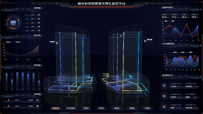 • 配变电与能源监控:通过 HT 3D 渲染将产业园大楼透明化,展示内部配电线路与设备布局,实时显示支路用能(如支路-1 61kW、支路-2 30kW)、实时功率(三相电压 380V、三相电流动态变化)等数据;采用环形图展示不同支路能耗占比,柱状图展示本周/本月能耗趋势,无需依赖第三方图表插件。