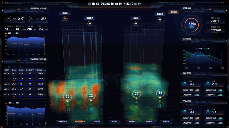 • 数据交互:支持基于 HTTP/WS 协议构建数据传输通道,实时对接园区环境监测、能源管理、安防、消防等子系统的数据库或API接口,实现数据秒级更新,保障可视化面板与实际设备状态的同步性。