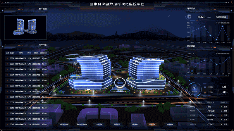 • 模式切换:基于 HT 的逻辑控制接口,开发上班、下班、休息三种照明模式,运维人员可通过 2D 面板远程切换模式,或根据环境照度(如 696.6lux)自动调节灯具亮度;在 3D 场景中可查看各楼层灯具状态(如灯开数 128、灯关数 89),故障灯具会标红提示(如“南区 01 层 LED 灯故障,报修时间 13:48”)。