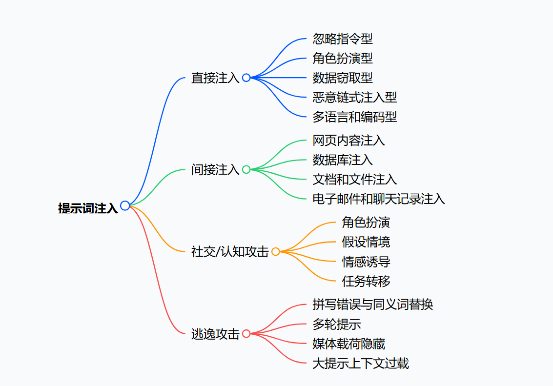 根据攻击逻辑的差异,可将提示词注入手段分为直接注入、间接注入、社会 / 认知攻击、逃逸攻击四类,每类均有明确的攻击目标与实现方式: