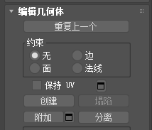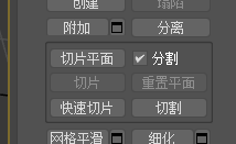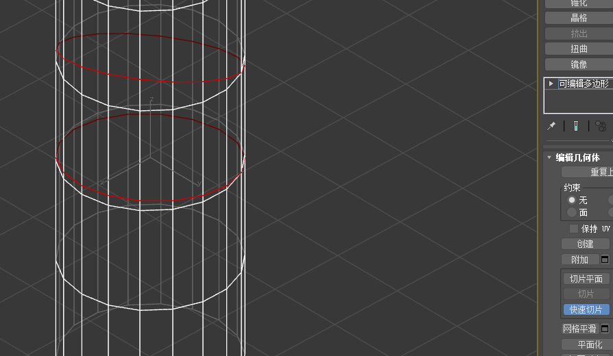 右侧修改器堆栈里选择 "边"子级别 (这里一定要选择边 网上说可以选择多边形然而根本不行)→ 在"Edit Geometry"卷展栏下点 Slice Plane(切片平面)。这时圆柱上会出现一个黄色/橙色线框。