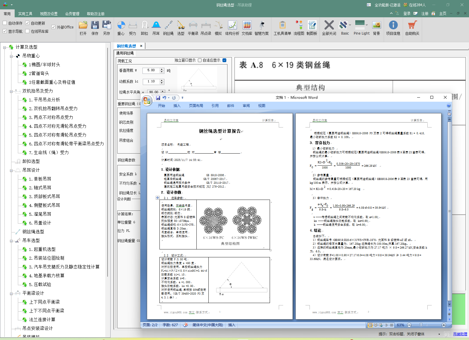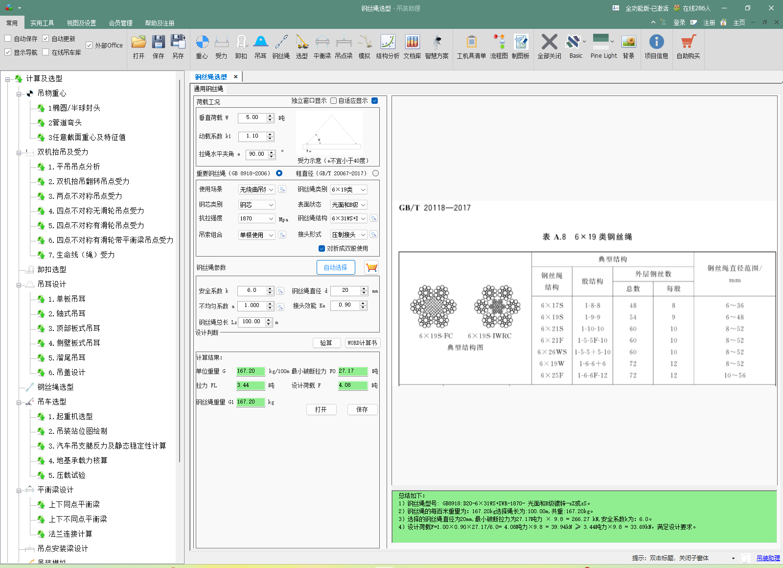 内置 GB 8918《重要钢丝绳》和 GB/T 20067《粗直径钢丝绳》的完整型号与力学性能数据库,并与计算引擎深度绑定。选择钢丝绳不再是简单的查表,而是基于完整受力模型的匹配过程。