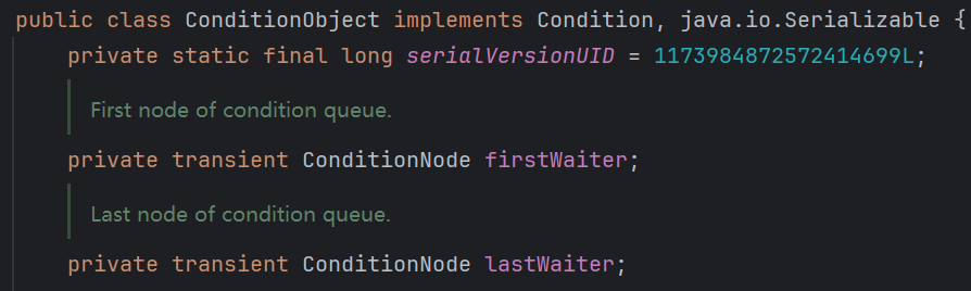 ConditionObject 是 Condition 的默认实现,内部维护条件队列的头尾节点(firstWaiter 和lastWaiter)
