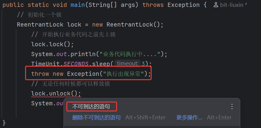 public class Demo_1103 {public static void main(String[] args) throws Exception {// 初始化一个锁ReentrantLock lock = new ReentrantLock();try {// 开始执行业务代码之前先上锁lock.lock();System.out.println("业务代码执行中....");TimeUnit.SECONDS.sleep(3);throw new Exception("执行出现异常");} finally {// 无论任何时候都可以释放锁lock.unlock();System.out.println("锁已释放");}}